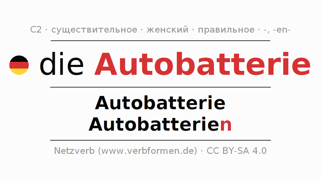 - Множественное число: die Autobatterien, der Autobatterien, den Autobatterien, die Autobatterien