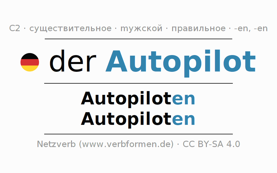 - Единственное число: der Autopilot, des Autopiloten, dem Autopiloten, den Autopiloten
