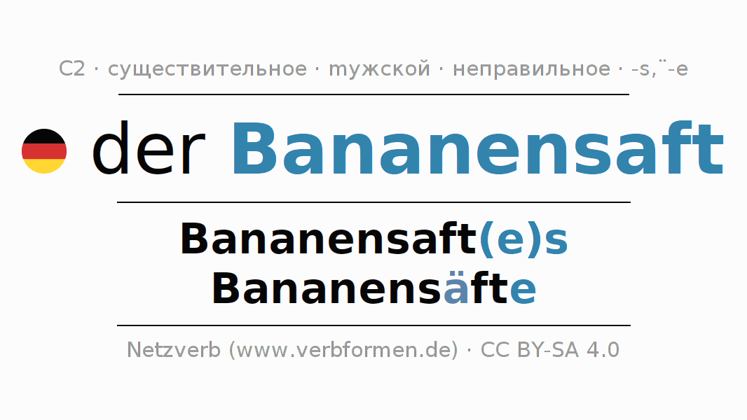 - Множественное число: die Bananensäfte, der Bananensäfte, den Bananensäften, die Bananensäfte