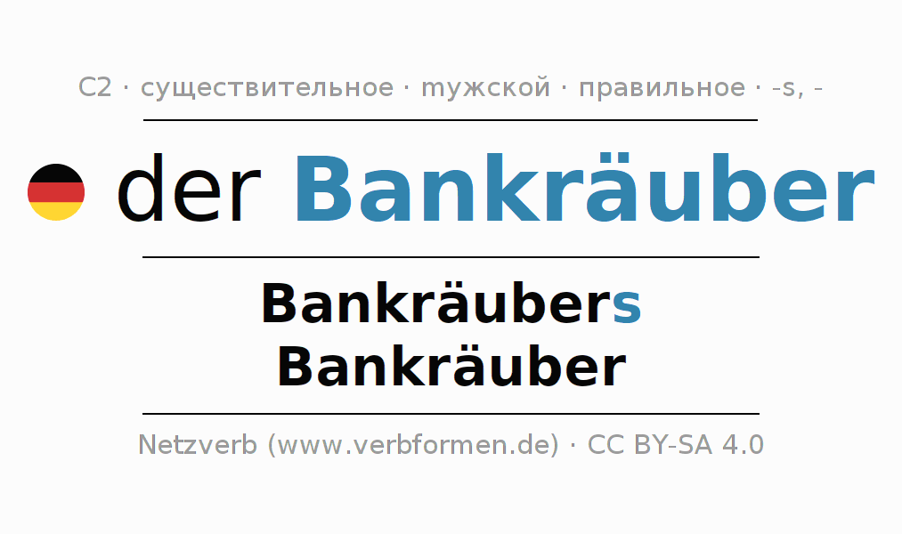 - Множественное число: die Bankräuber, der Bankräuber, den Bankräubern, die Bankräuber