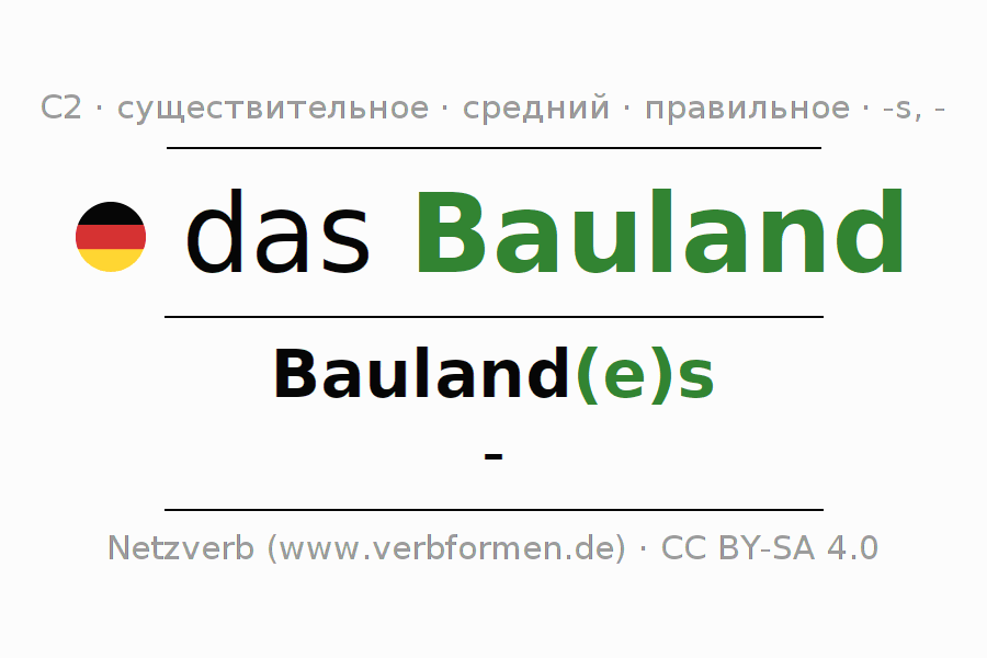 Склонение существительного Bauland (земельный участок, обрабатываемая земля) даётся в родительном падеже единственного числаBauland(e)s и в именительном падеже множественного числа -. Существительное Bauland склоняется по сильному типу, получая окончания es/-. Не образует форм множественного числа. Грамматический род Bauland средний с определённым артиклем "das" Здесь можно просклонять не только Bauland, но и все немецкие существительные. Существительное включён в словарный запас обладателя сертификата знания немецкого языка уровня C2. Kомментарии ☆
