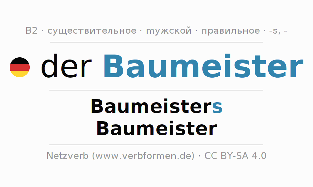 - Единственное число: der Baumeister, des Baumeisters, dem Baumeister, den Baumeister