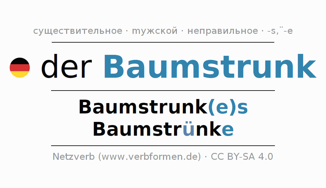 - Множественное число: die Baumstrünke, der Baumstrünke, den Baumstrünken, die Baumstrünke