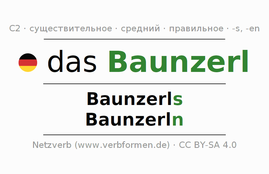 Склонение существительного Baunzerl (булочка с молоком) даётся в родительном падеже единственного числаBaunzerls и в именительном падеже множественного числа Baunzerln. Существительное Baunzerl склоняется по смешанному типу, получая окончания s/n. Грамматический род Baunzerl средний с определённым артиклем "das" Здесь можно просклонять не только Baunzerl, но и все немецкие существительные. Существительное включён в словарный запас обладателя сертификата знания немецкого языка уровня C2. Kомментарии ☆