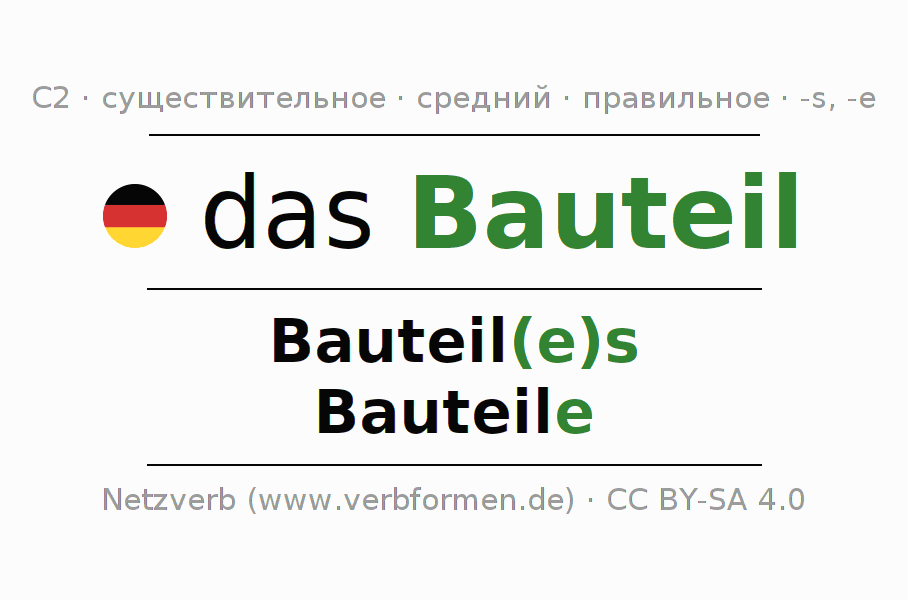 - Множественное число: die Bauteile, der Bauteile, den Bauteilen, die Bauteile