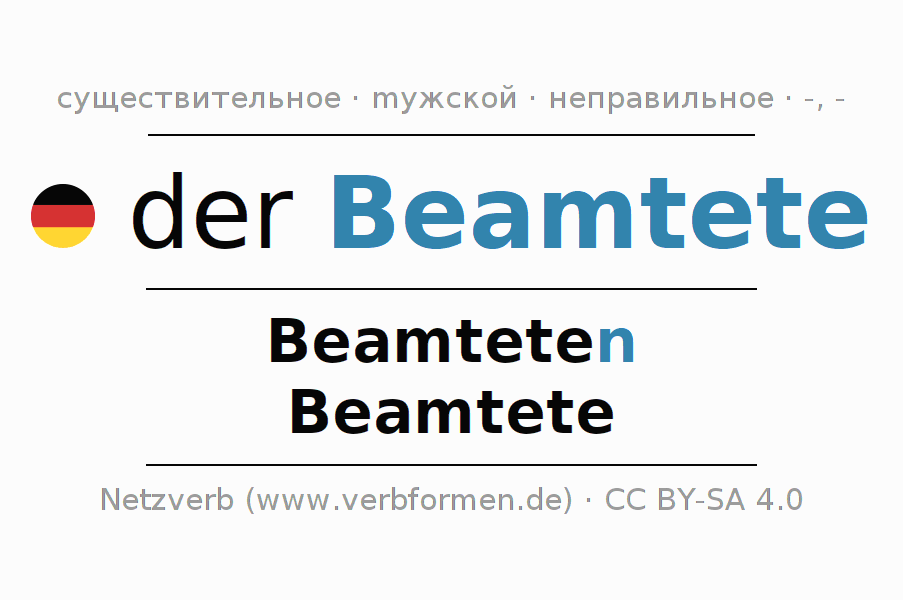- Единственное число: der Beamtete, des Beamteten, dem Beamteten, den Beamteten