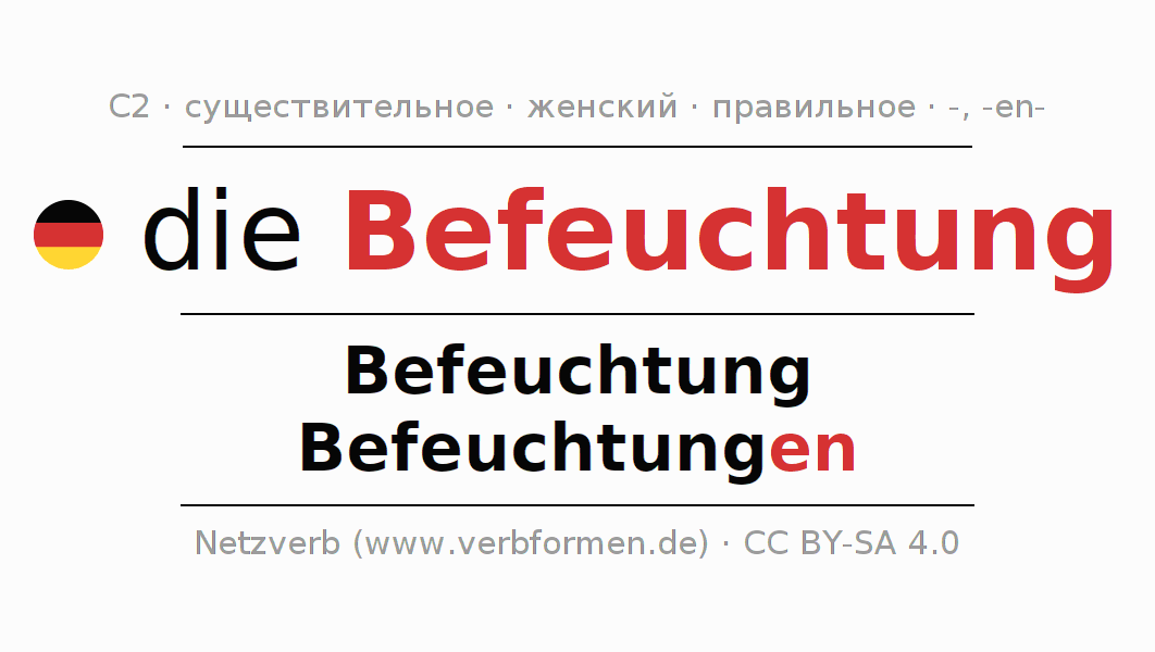 - Единственное число: die Befeuchtung, der Befeuchtung, der Befeuchtung, die Befeuchtung