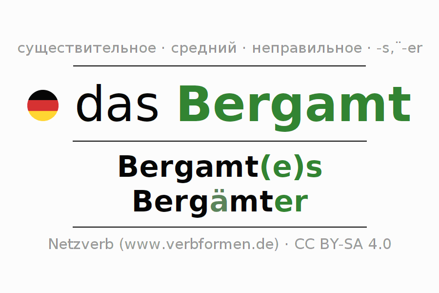 Склонение существительного Bergamt (го́рная инспе́кция, го́рное ве́домство) даётся в родительном падеже единственного числаBergamt(e)s и в именительном падеже множественного числа Bergämter. Существительное Bergamt склоняется по сильному типу, получая окончания es/ä-er. Во множественном числе стоит умлаут. Грамматический род Bergamt средний с определённым артиклем "das" Здесь можно просклонять не только Bergamt, но и все немецкие существительные. Kомментарии ☆