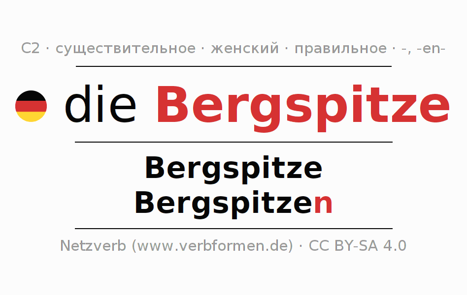 - Множественное число: die Bergspitzen, der Bergspitzen, den Bergspitzen, die Bergspitzen