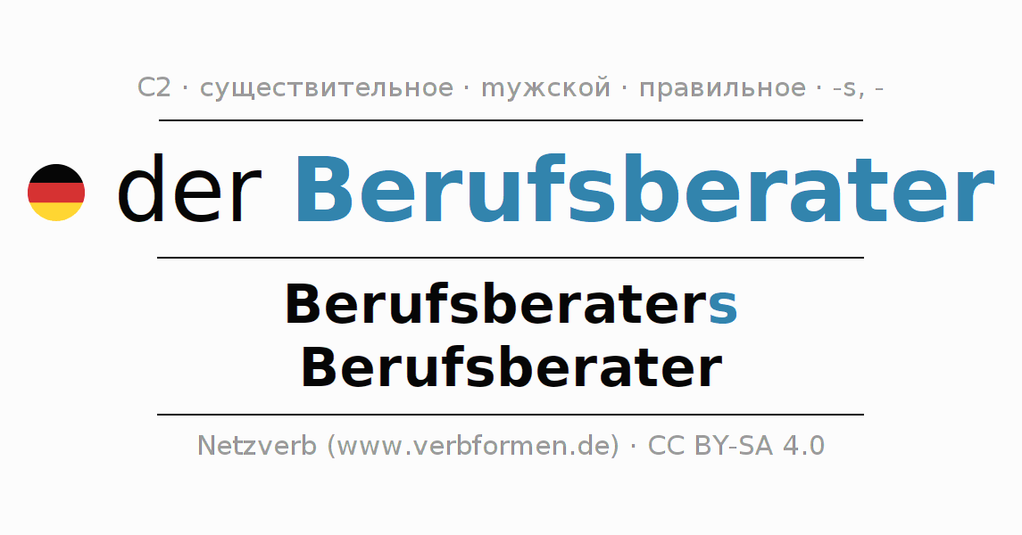 - Множественное число: die Berufsberater, der Berufsberater, den Berufsberatern, die Berufsberater