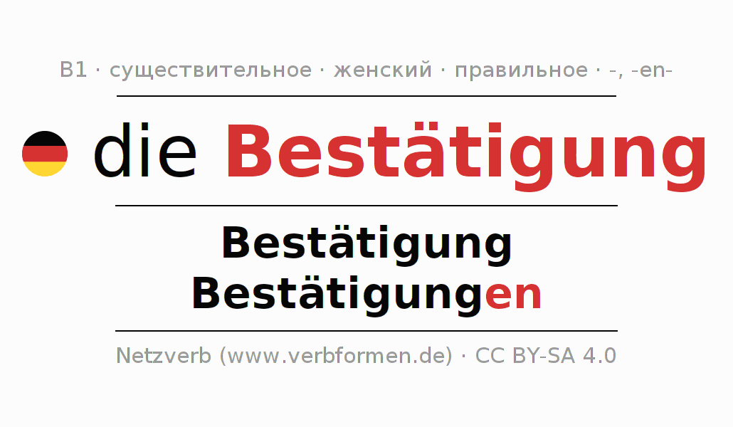 - Множественное число: die Bestätigungen, der Bestätigungen, den Bestätigungen, die Bestätigungen