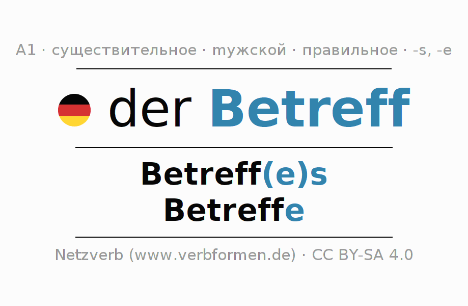 - Единственное число: der Betreff, des Betreff(e)s, dem Betreff(e), den Betreff