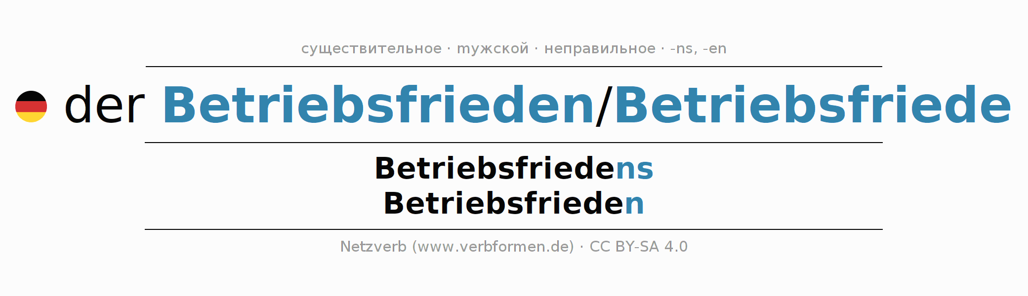 - Единственное число: der Betriebsfriede(n), des Betriebsfriedens, dem Betriebsfrieden, den Betriebsfrieden
