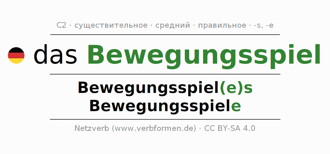 - Множественное число: die Bewegungsspiele, der Bewegungsspiele, den Bewegungsspielen, die Bewegungsspiele