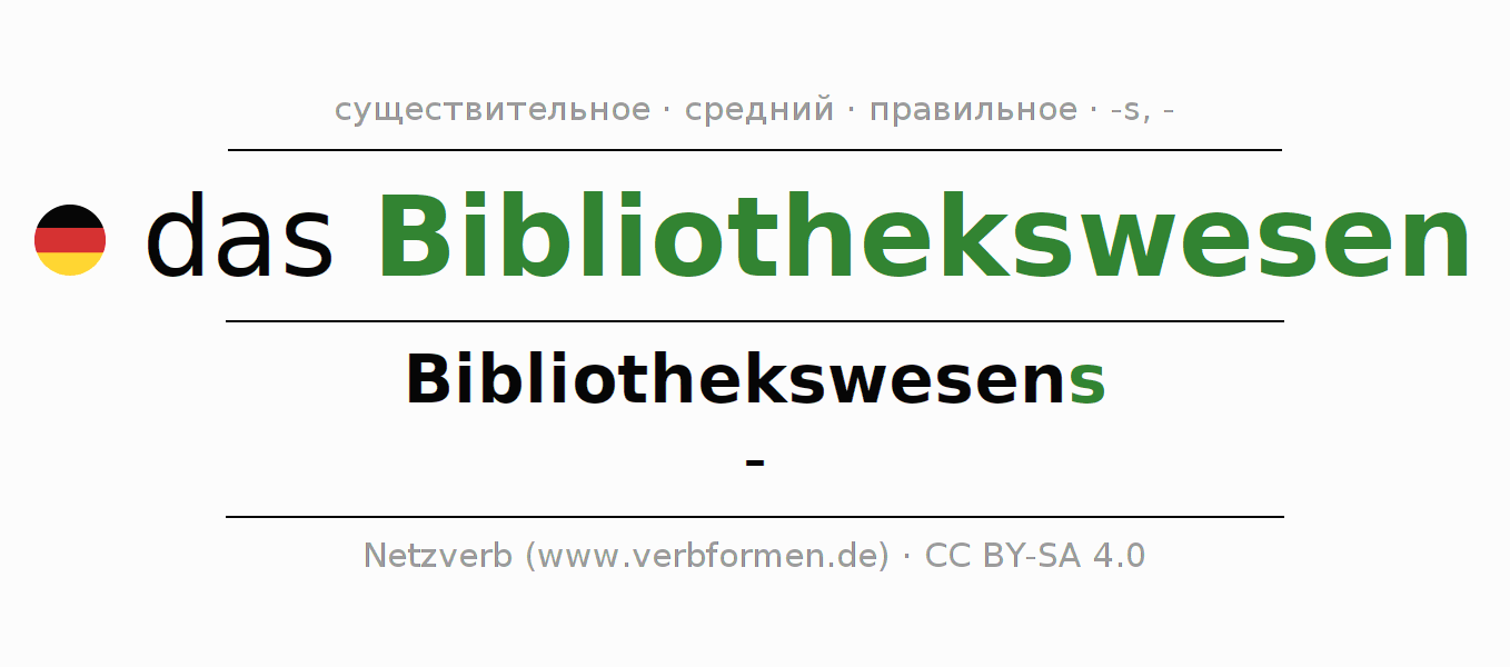 Склонение существительного Bibliothekswesen (библиотечное дело, библиотечное управление) даётся в родительном падеже единственного числаBibliothekswesens и в именительном падеже множественного числа -. Существительное Bibliothekswesen склоняется по сильному типу, получая окончания s/-. Не образует форм множественного числа. Грамматический род Bibliothekswesen средний с определённым артиклем "das" Здесь можно просклонять не только Bibliothekswesen, но и все немецкие существительные. Kомментарии ☆