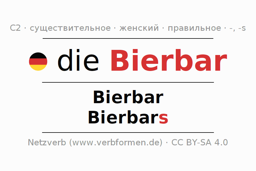 - Множественное число: die Bierbars, der Bierbars, den Bierbars, die Bierbars