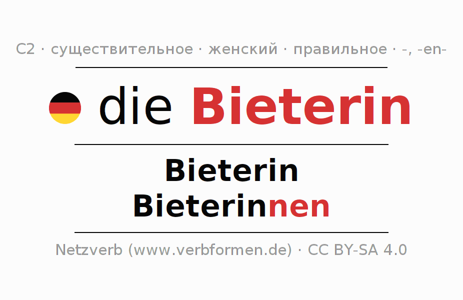 - Множественное число: die Bieterinnen, der Bieterinnen, den Bieterinnen, die Bieterinnen