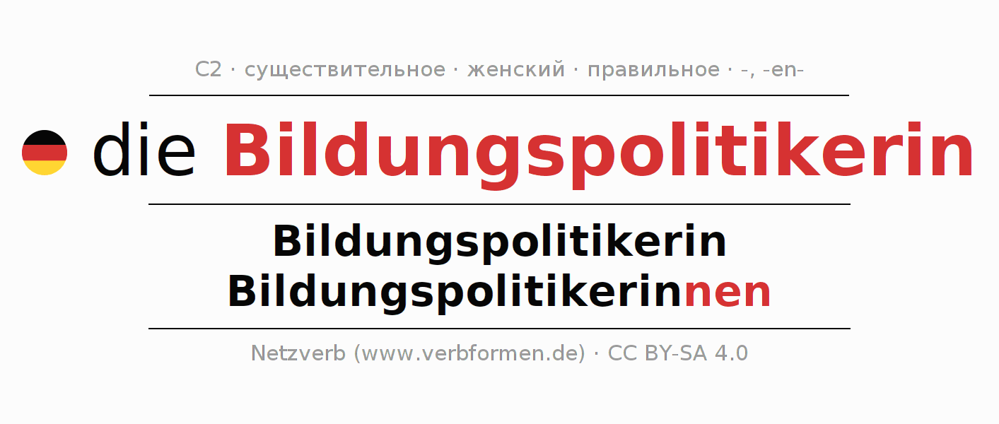 - Единственное число: die Bildungspolitikerin, der Bildungspolitikerin, der Bildungspolitikerin, die Bildungspolitikerin