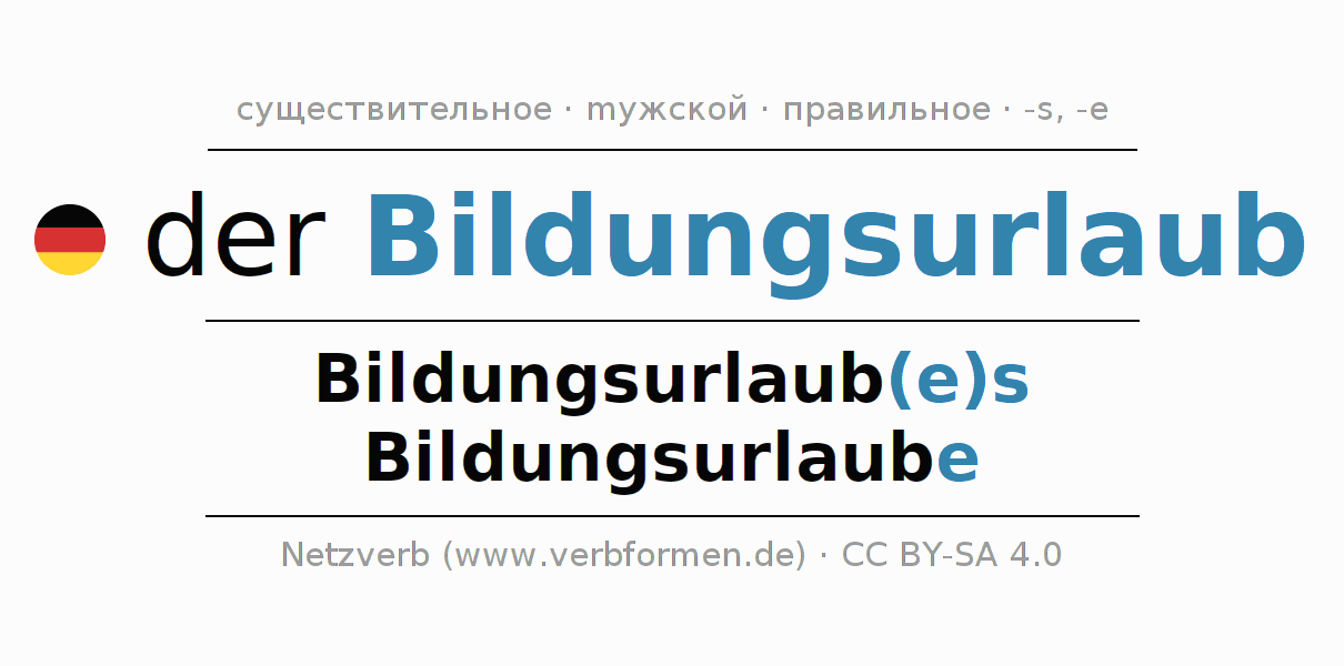 - Единственное число: der Bildungsurlaub, des Bildungsurlaub(e)s, dem Bildungsurlaub(e), den Bildungsurlaub