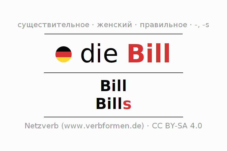 - Множественное число: die Bills, der Bills, den Bills, die Bills