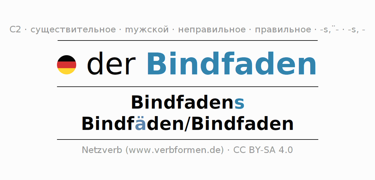 - Единственное число: der Bindfaden, des Bindfadens, dem Bindfaden, den Bindfaden