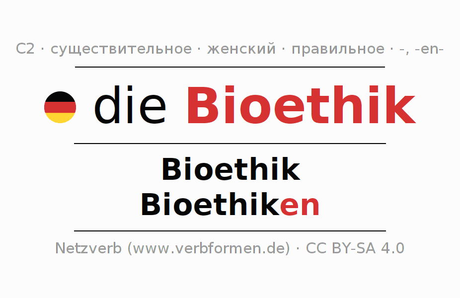 Склонение существительного Bioethik (биоэтика, биоэ́тика) даётся в родительном падеже единственного числаBioethik и в именительном падеже множественного числа Bioethiken. Существительное Bioethik склоняется по слабому типу, получая окончания -/en. Грамматический род Bioethik женский с определённым артиклем "die" Здесь можно просклонять не только Bioethik, но и все немецкие существительные. Существительное включён в словарный запас обладателя сертификата знания немецкого языка уровня C2. Kомментарии ☆