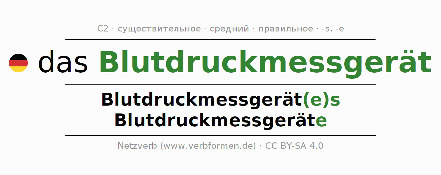 - Единственное число: das Blutdruckmessgerät, des Blutdruckmessgerät(e)s, dem Blutdruckmessgerät(e), das Blutdruckmessgerät