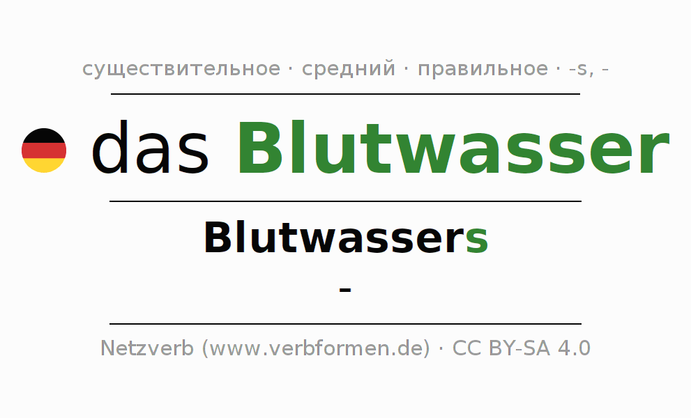 Склонение существительного Blutwasser даётся в родительном падеже единственного числаBlutwassers и в именительном падеже множественного числа -. Существительное Blutwasser склоняется по сильному типу, получая окончания s/-. Не образует форм множественного числа. Грамматический род Blutwasser средний с определённым артиклем "das" Здесь можно просклонять не только Blutwasser, но и все немецкие существительные. Kомментарии ☆