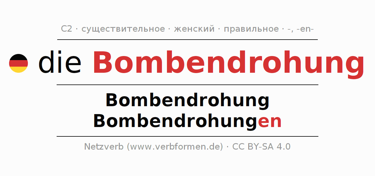 - Множественное число: die Bombendrohungen, der Bombendrohungen, den Bombendrohungen, die Bombendrohungen