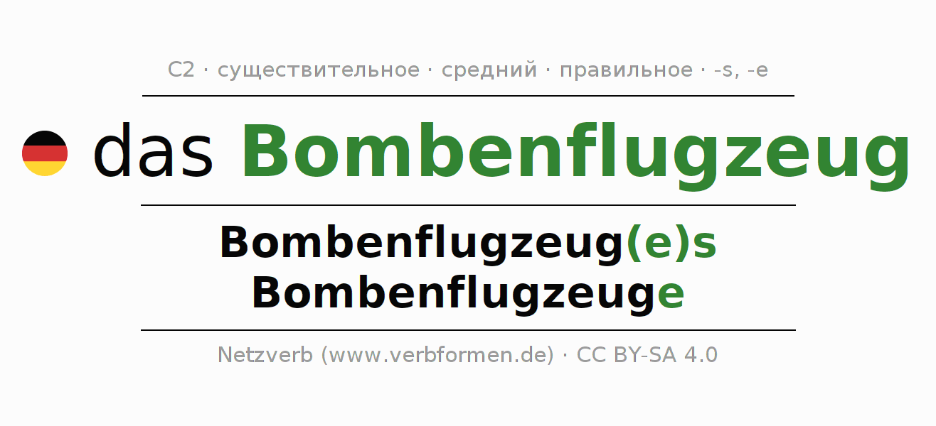 - Множественное число: die Bombenflugzeuge, der Bombenflugzeuge, den Bombenflugzeugen, die Bombenflugzeuge