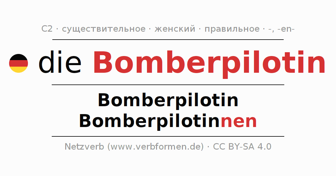 - Множественное число: die Bomberpilotinnen, der Bomberpilotinnen, den Bomberpilotinnen, die Bomberpilotinnen