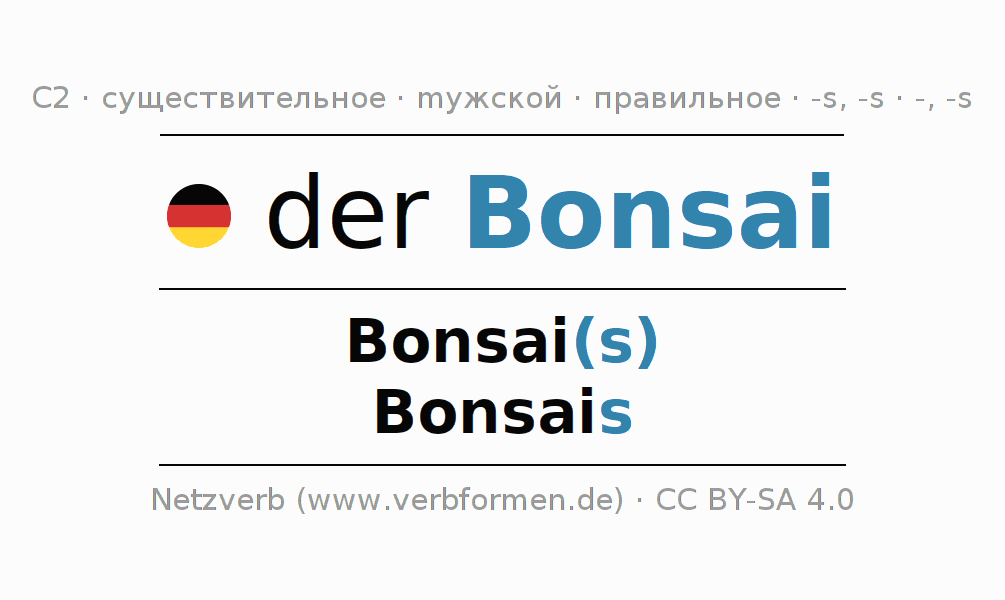 - Множественное число: die Bonsais, der Bonsais, den Bonsais, die Bonsais