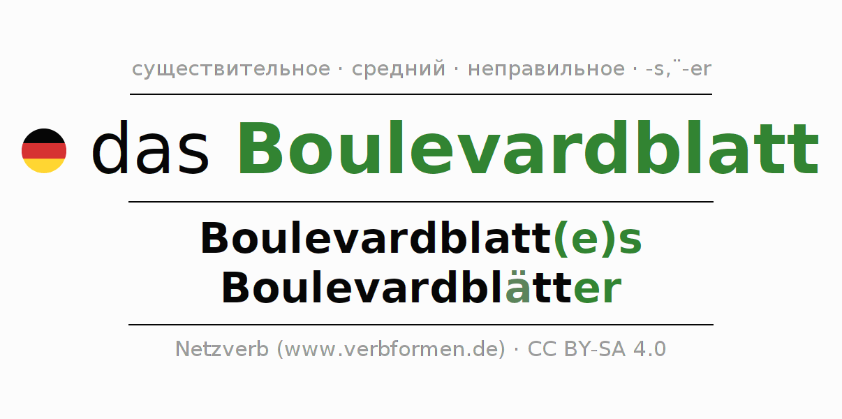 - Множественное число: die Boulevardblätter, der Boulevardblätter, den Boulevardblättern, die Boulevardblätter