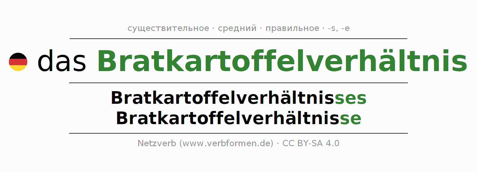 - Единственное число: das Bratkartoffelverhältnis, des Bratkartoffelverhältnisses, dem Bratkartoffelverhältnis, das Bratkartoffelverhältnis