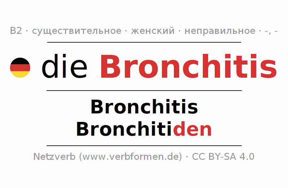 - Единственное число: die Bronchitis, der Bronchitis, der Bronchitis, die Bronchitis