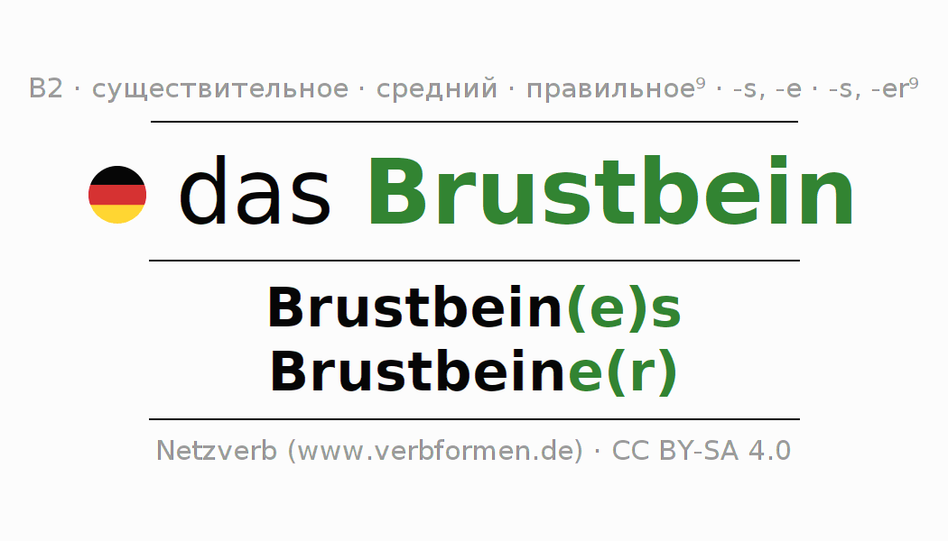 Склонение существительного Brustbein (грудина, груди́на) даётся в родительном падеже единственного числаBrustbein(e)s и в именительном падеже множественного числа Brustbeine(r). Существительное Brustbein склоняется по сильному типу, получая окончания es/e/er. Грамматический род Brustbein средний с определённым артиклем "das" Здесь можно просклонять не только Brustbein, но и все немецкие существительные. Существительное включён в словарный запас обладателя сертификата знания немецкого языка уровня B2. Kомментарии ☆