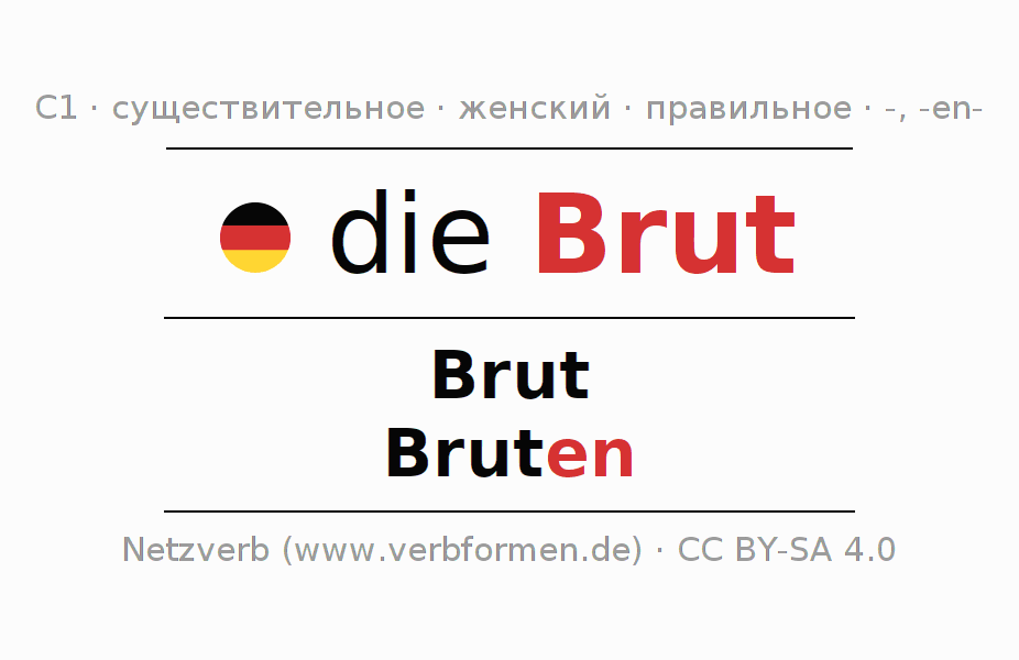 Склонение слова Brut онлайн представлено в виде сводной таблицы со всеми формами единственного и множественного числа (множественное число) во всех четырех падежах - именительном (номинатив или 1-й падеж - кто? что?), родительном (генитив или 2-й падеж - кого? чего? чей?), дательном (датив или 3-й падеж - кому? чему?) и винительном (аккузатив или 4-й падеж - кого? что?). Материалы по склонению существительного ... могут быть использованы в качестве пособия при подготовке домашних заданий, проведении экзаменов, контрольных работ, при преподавании немецкого языка в школе, изучении немецкого языка как иностранного (DaF) и как второго (DaZ), а также при обучении взрослых. Для изучающих немецкий язык знание правильного склонения слова Brut имеет важное значение. Более подробную информацию Вы найдёте на ... викисловаря ... и на ... в Дудене.