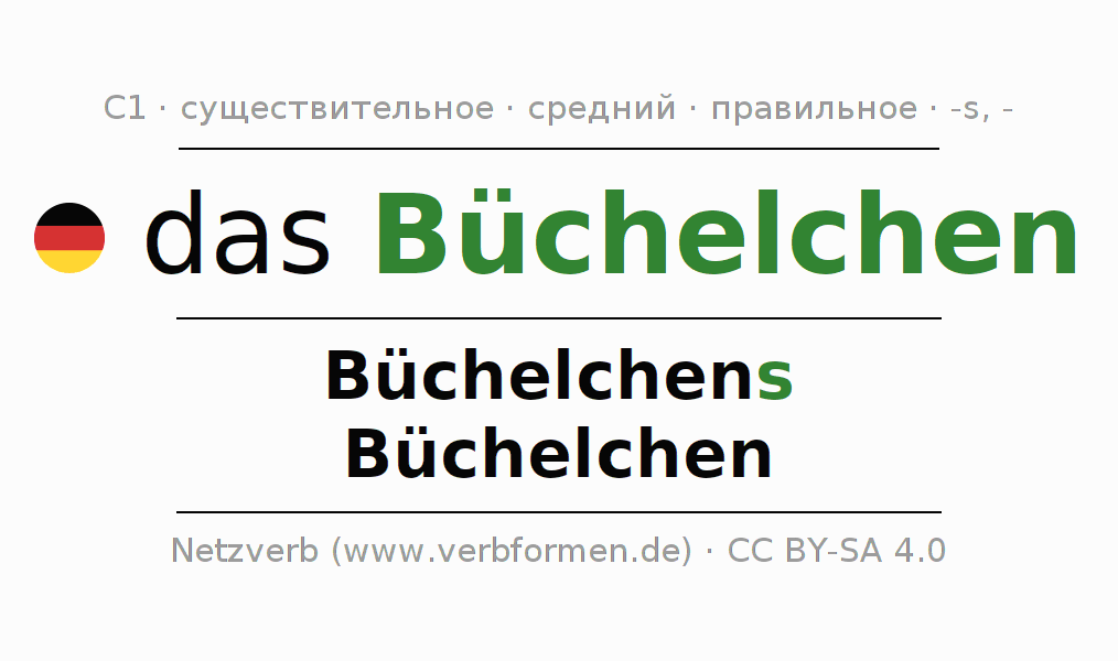 - Единственное число: das Büchelchen, des Büchelchens, dem Büchelchen, das Büchelchen