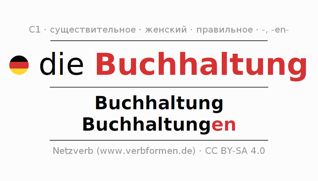 - Множественное число: die Buchhaltungen, der Buchhaltungen, den Buchhaltungen, die Buchhaltungen