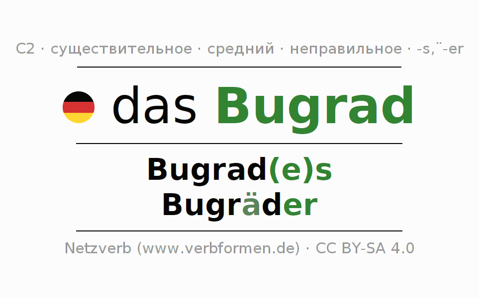 Склонение существительного Bugrad (шасси) даётся в родительном падеже единственного числаBugrad(e)s и в именительном падеже множественного числа Bugräder. Существительное Bugrad склоняется по сильному типу, получая окончания es/ä-er. Во множественном числе стоит умлаут. Грамматический род Bugrad средний с определённым артиклем "das" Здесь можно просклонять не только Bugrad, но и все немецкие существительные. Существительное включён в словарный запас обладателя сертификата знания немецкого языка уровня C2. Kомментарии ☆