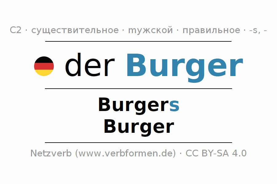 - Множественное число: die Burger, der Burger, den Burgern, die Burger