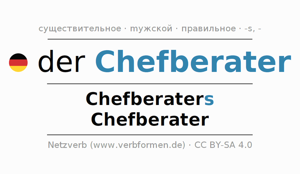 - Единственное число: der Chefberater, des Chefberaters, dem Chefberater, den Chefberater