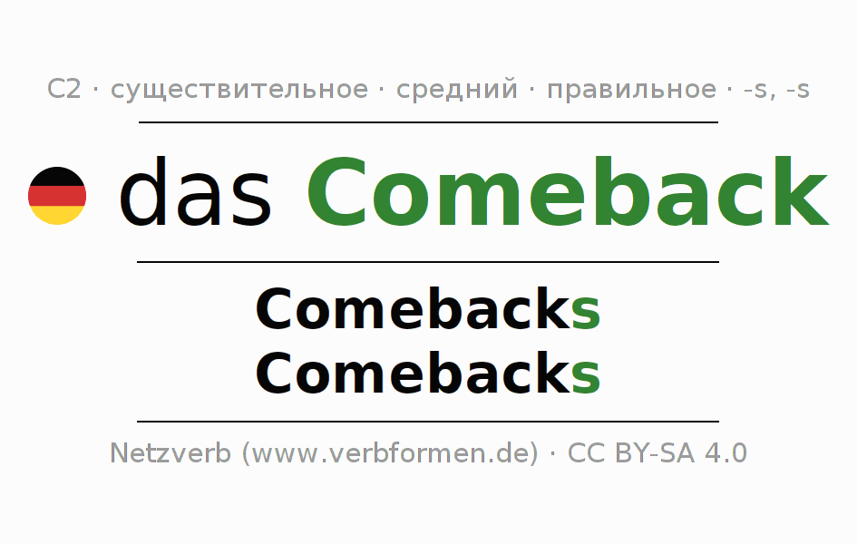 Склонение существительного Comeback (возвращение, возвраще́ние) даётся в родительном падеже единственного числаComebacks и в именительном падеже множественного числа Comebacks. Существительное Comeback склоняется по сильному типу, получая окончания s/s. Грамматический род Comeback средний с определённым артиклем "das" Здесь можно просклонять не только Comeback, но и все немецкие существительные. Существительное включён в словарный запас обладателя сертификата знания немецкого языка уровня C2. Kомментарии ☆