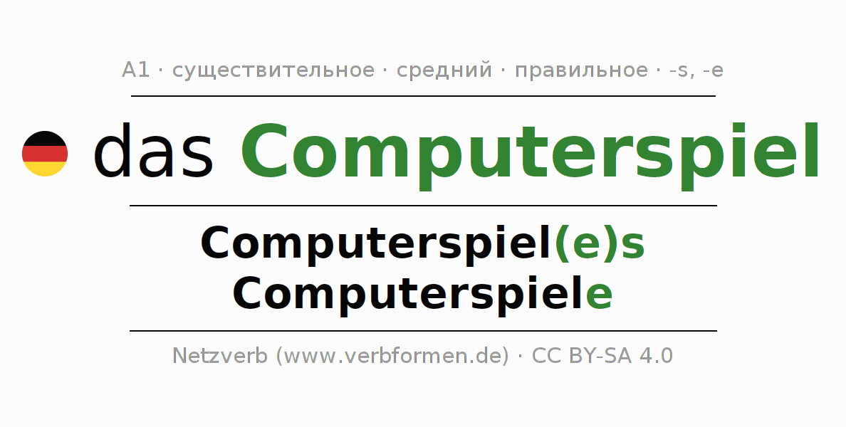 - Множественное число: die Computerspiele, der Computerspiele, den Computerspielen, die Computerspiele