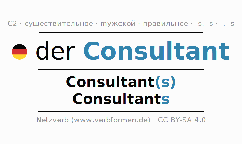 - Множественное число: die Consultants, der Consultants, den Consultants, die Consultants