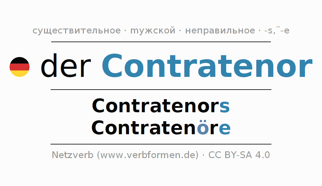 Склонение существительного Contratenor даётся в родительном падеже единственного числаContratenors и в именительном падеже множественного числа Contratenöre. Существительное Contratenor склоняется по сильному типу, получая окончания s/ö-e. Во множественном числе стоит умлаут. Грамматический род Contratenor мужской с определённым артиклем "der" Здесь можно просклонять не только Contratenor, но и все немецкие существительные. Kомментарии ☆
