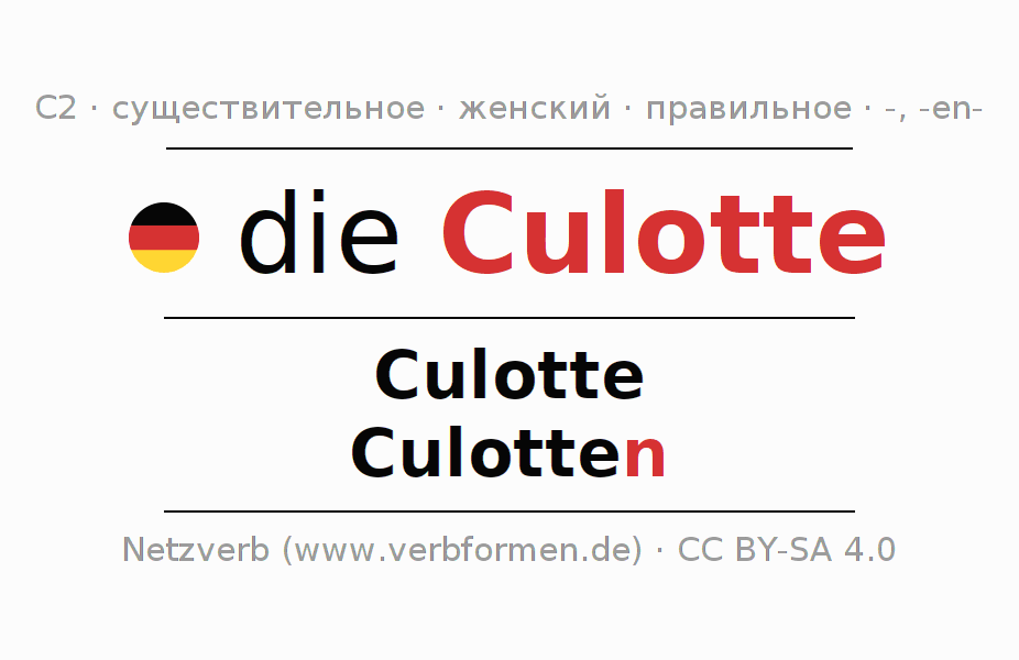 - Единственное число: die Culotte, der Culotte, der Culotte, die Culotte