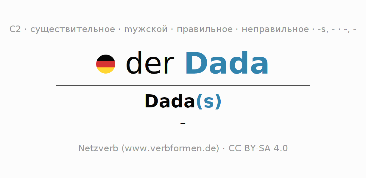 Склонение существительного Dada (дадаизм, дадаи́зм) даётся в родительном падеже единственного числаDada(s) и в именительном падеже множественного числа -. Существительное Dada склоняется по сильному типу, получая окончания s/-/-. Не образует форм множественного числа. Грамматический род Dada мужской с определённым артиклем "der" Здесь можно просклонять не только Dada, но и все немецкие существительные. Существительное включён в словарный запас обладателя сертификата знания немецкого языка уровня C2. Kомментарии ☆