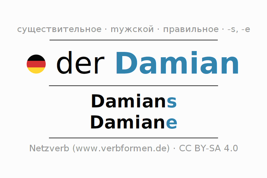 - Единственное число: der Damian, des Damians, dem Damian, den Damian