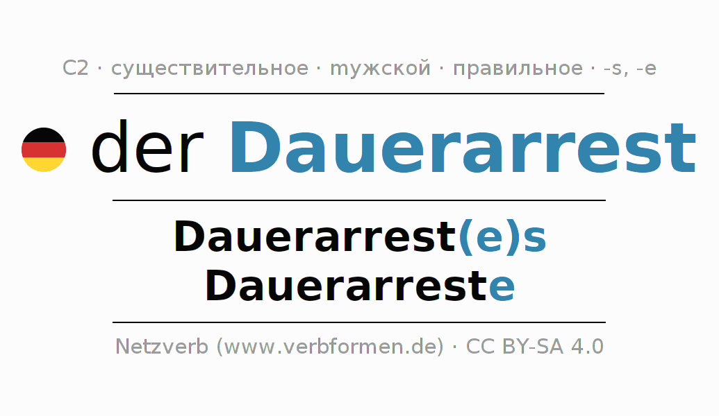 - Единственное число: der Dauerarrest, des Dauerarrest(e)s, dem Dauerarrest(e), den Dauerarrest